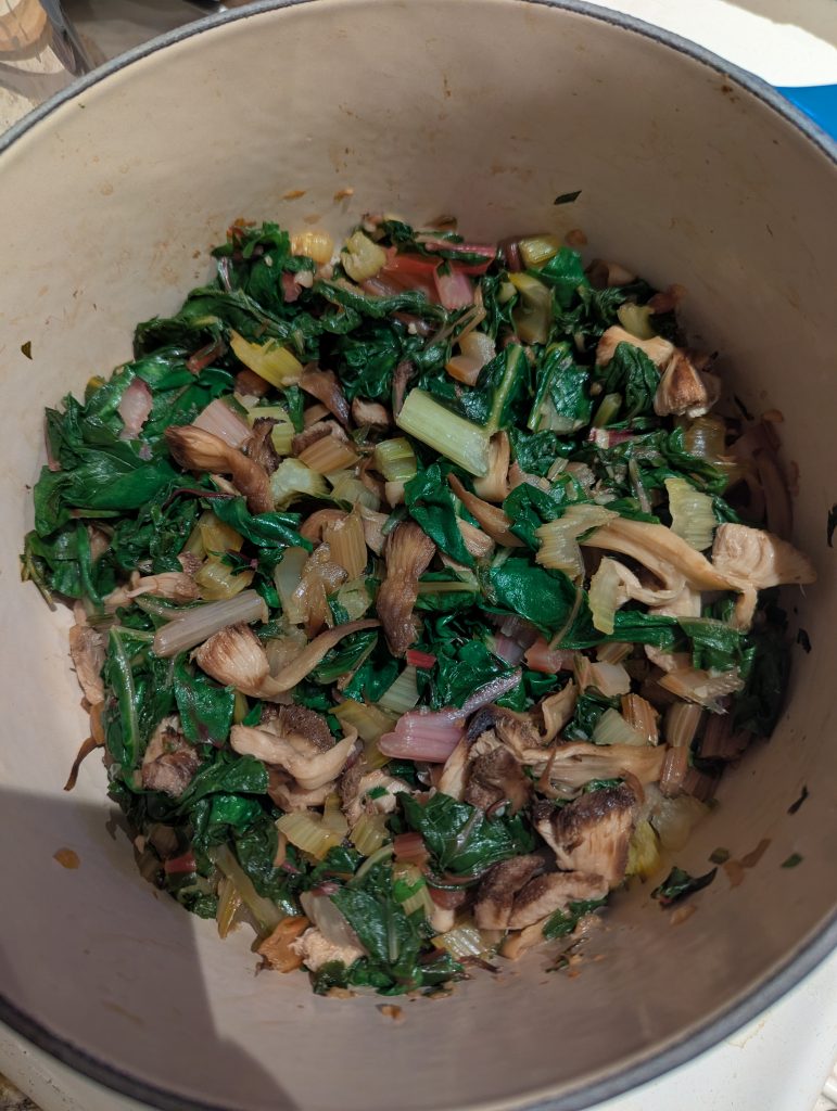 Sauté half a pound of lion’s mane mushrooms in about 1 tablespoon of olive oil, in a Dutch oven. Stir while browning. Alternatively, you could use baby bella mushrooms or whatever variety you have. Cook for 15 minutes on medium heat until dark brown. Then add two cloves of chopped garlic and salt, and cook for one minute. Then add one bunch of chopped Swiss Chard until it wilts. Add a squeeze of lemon or lime and salt before serving.